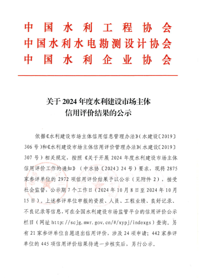 關(guān)于2024年度水利建設(shè)市場主體信用評(píng)價(jià)結(jié)果的公示